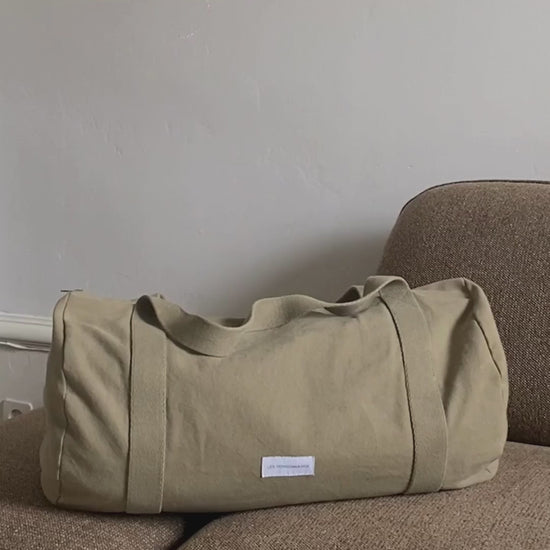 Grote capaciteit van 35L (50 cm lang, diameter 30 cm), en toch geschikt als handbagage. Gemaakt van dik en stevig biologisch katoenen canvas, gevoerd met een mooie gecoate stof met een zeer fijn grijs geruit patroon. Het heeft een binnenvak met ritssluiting.