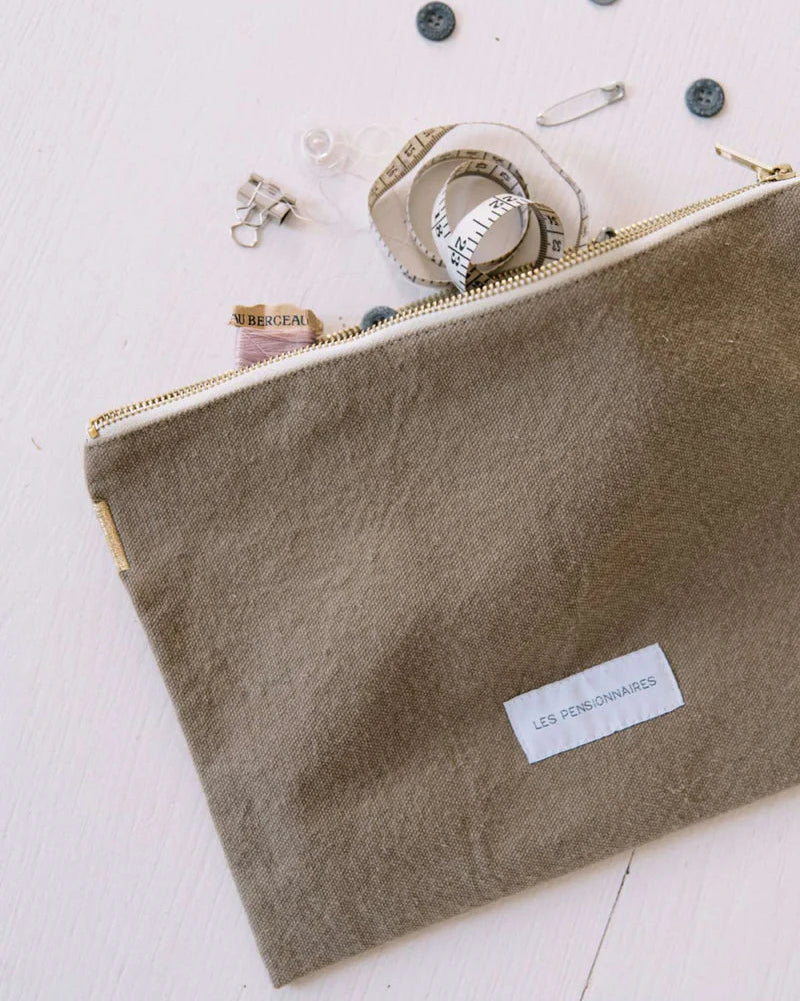 Wat niet in onze kleine pouch past, past wel in deze grote pouch: je huidige roman, Bullet Journal of een kleine tablet. Voor wie graag zijn vertrouwde producten mee op trip neemt, het past er allemaal in. Om in je tas te steken of om trots te dragen als modeaccessoire!
