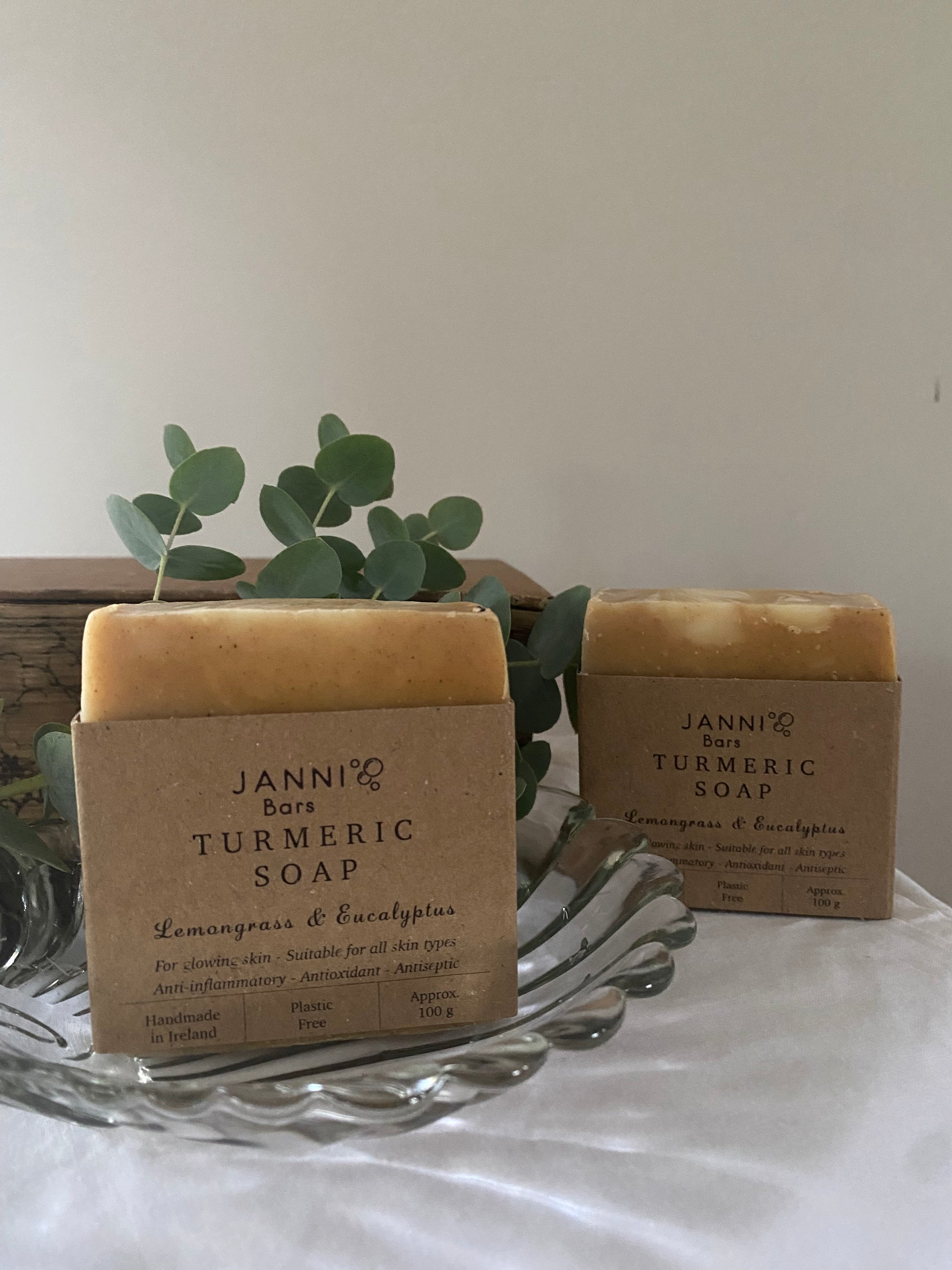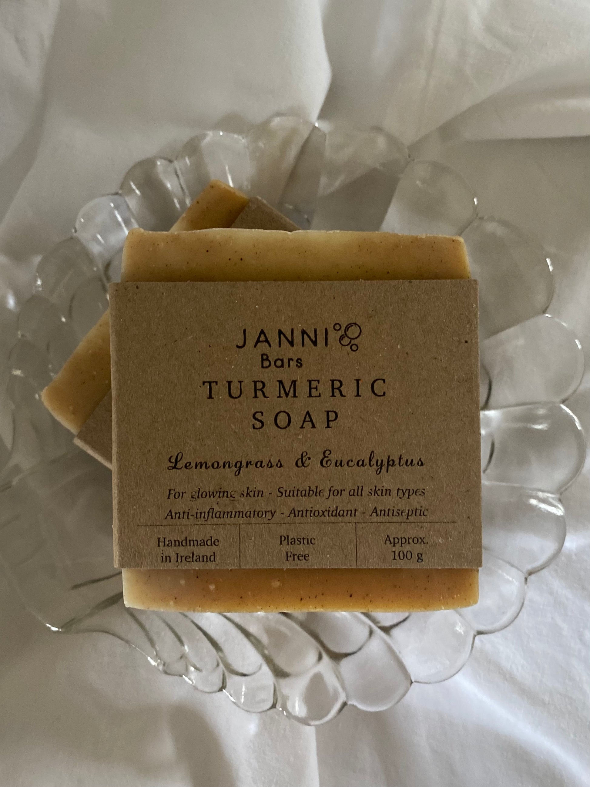 Licht exfoliërende zeep met kurkuma, citroengras en eucalyptus.
