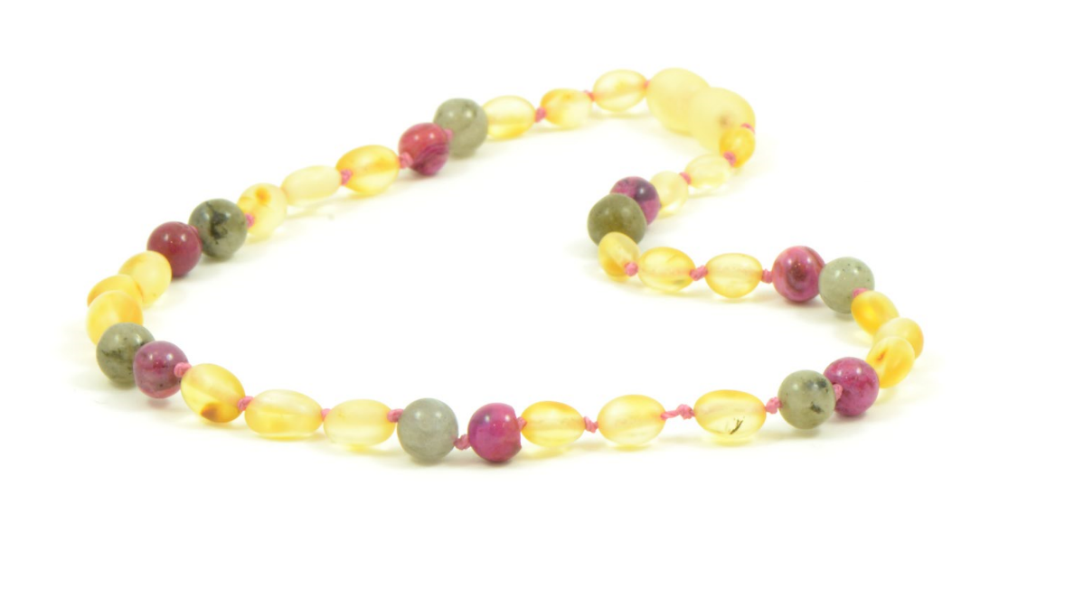Barnsteen halsketting | Citroen barnsteen, amber en roze agaat en labradoriet | kindermaat