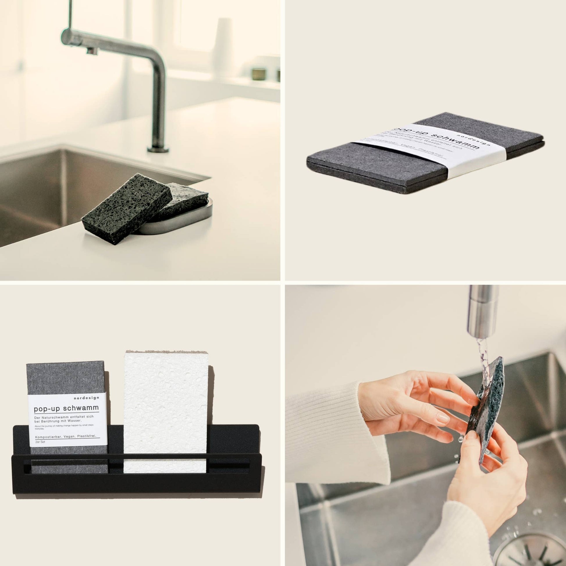 De pop-up spons van Nordesign combineert functionaliteit, duurzaamheid en design voor jou en is een natuurlijk alternatief voor conventionele plastic keukenspons. Ervaar het fascinerende pop-up effect wanneer de spons voor het eerst water raakt. Eenmaal geopend kan de pop-up spons universeel in uw huis worden gebruikt voor een zachte reiniging. De eenvoudige zwarte pop-up spons is een must-have voor elke moderne en duurzame keuken. Hij kan na meerdere wasbeurten gemakkelijk worden gecomposteerd. De pop-up spons van nordesign is gemaakt van 100% hernieuwbare houtcellulose.